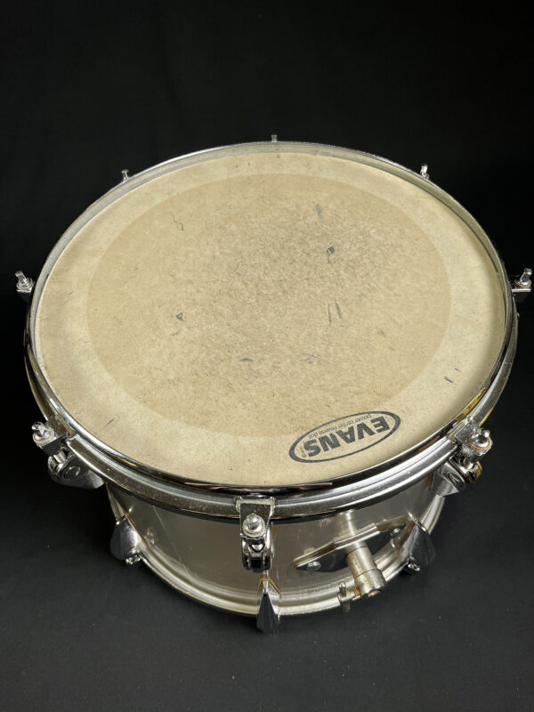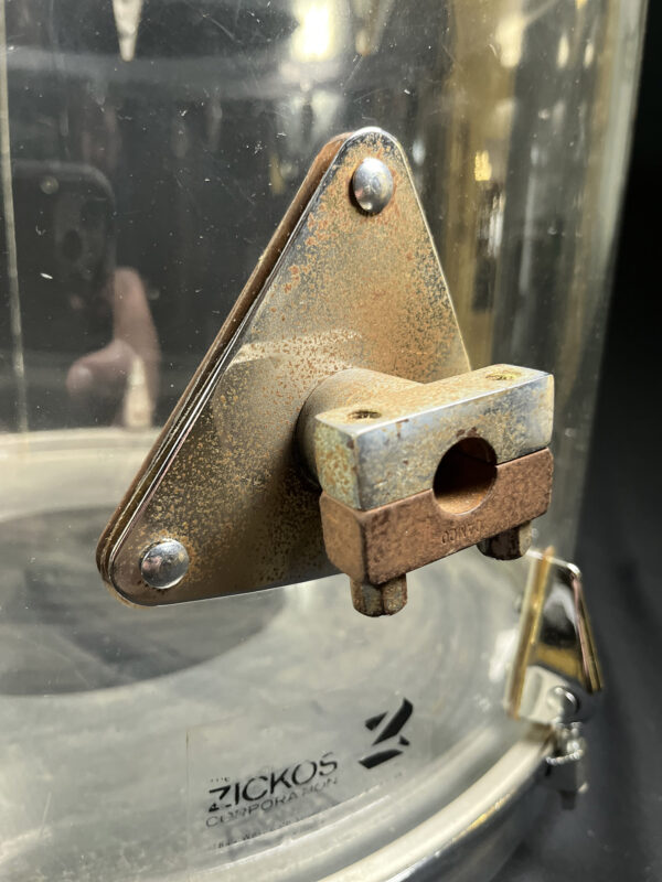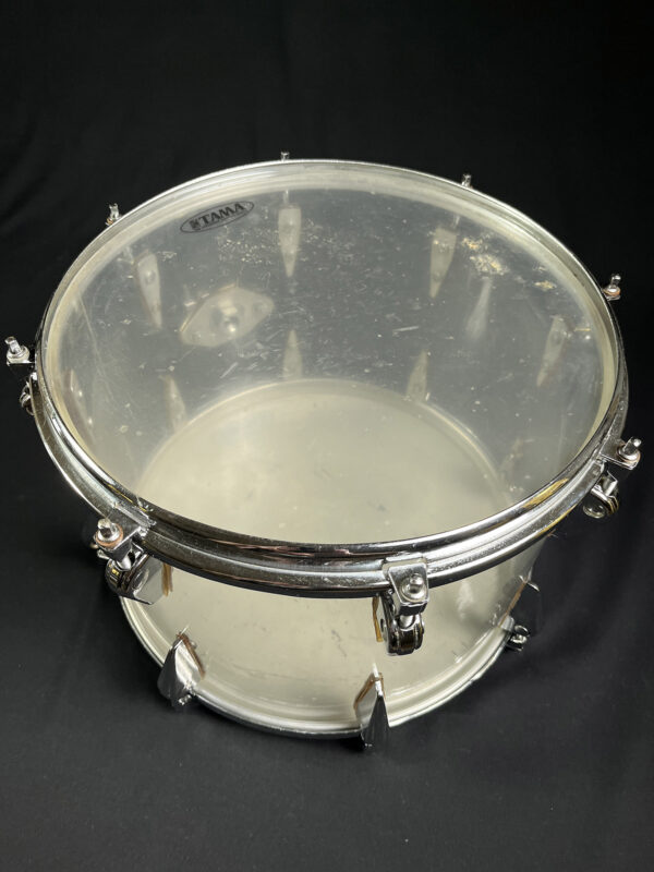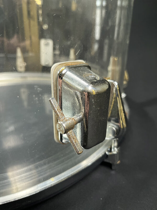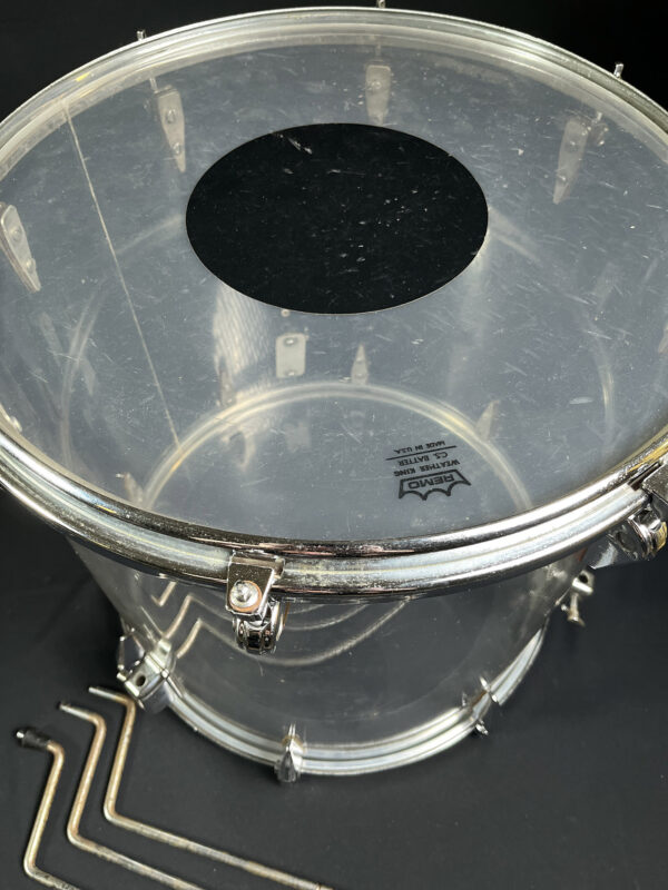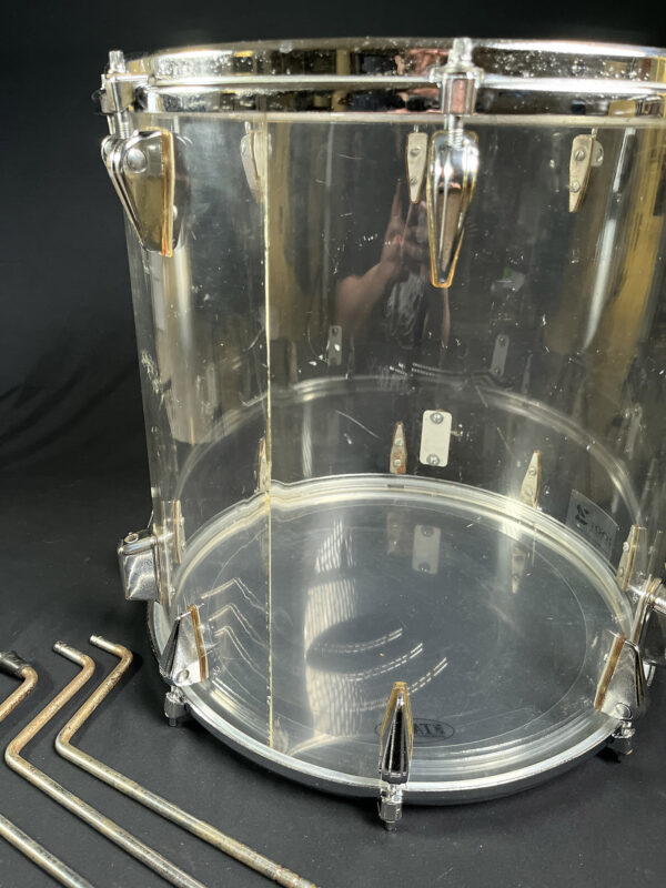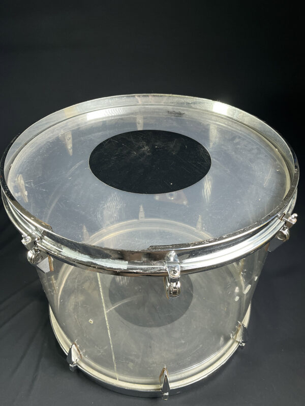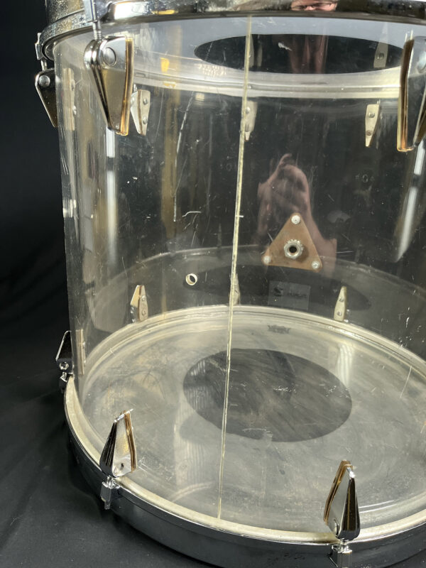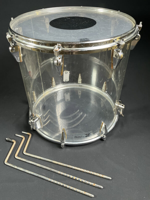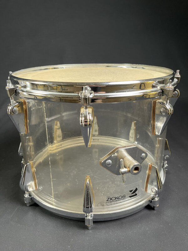 This is one of the earliest acrylic drum kits, we believe, designed by Zickos in the late 1960s. Zickos was a pioneer in producing transparent acrylic shells, which looked great and had bright punchy tone that cut through the live setting. This kit includes a bass drum and two toms, with each piece showcasing the iconic clear acrylic look.