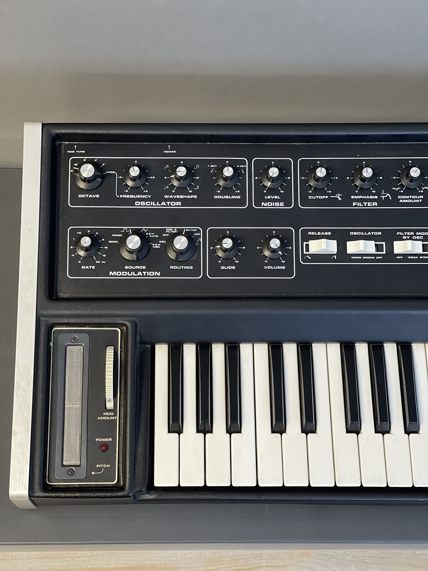 It has some noise when turning the pots and the keys may need cleaning. The keys have slightly inconsistent levels that may be fixed with cleaning. Condition is consistent with its age. There is a chip on the bottom wood (see photos).
