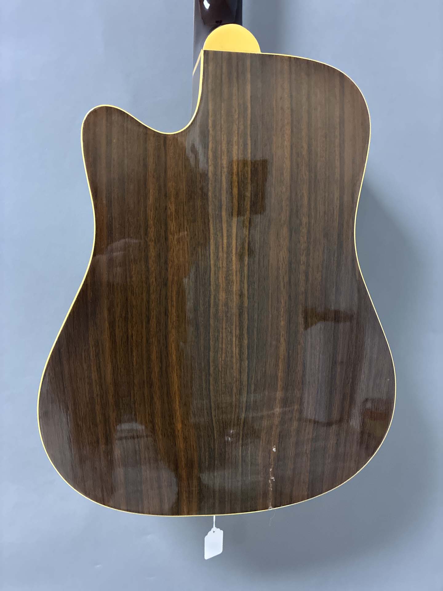 Crack on back, glued bridge, somewhat high action (truss rod works, so this could be improved)
