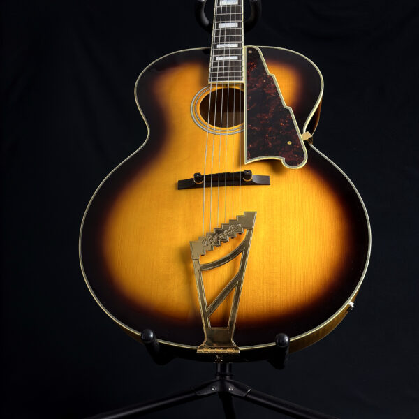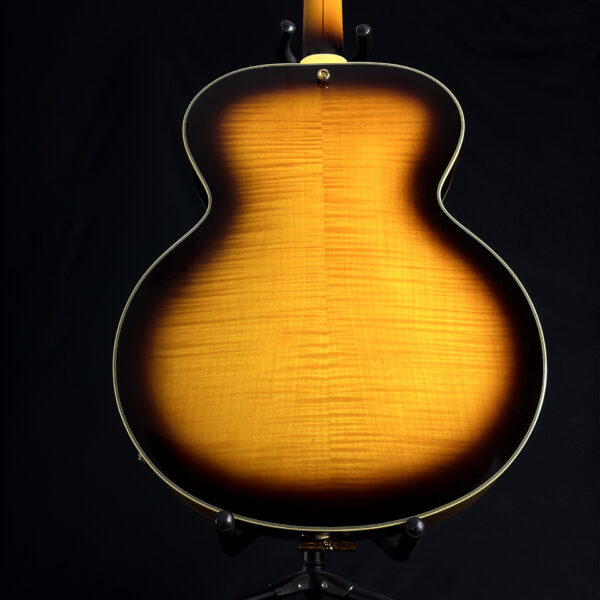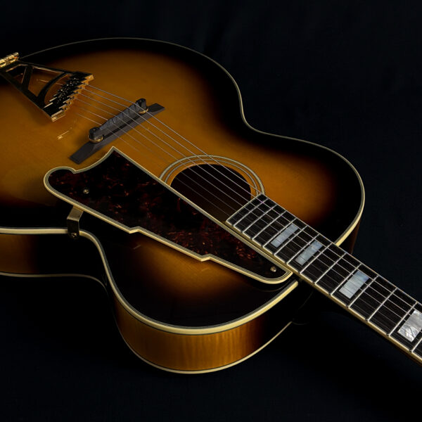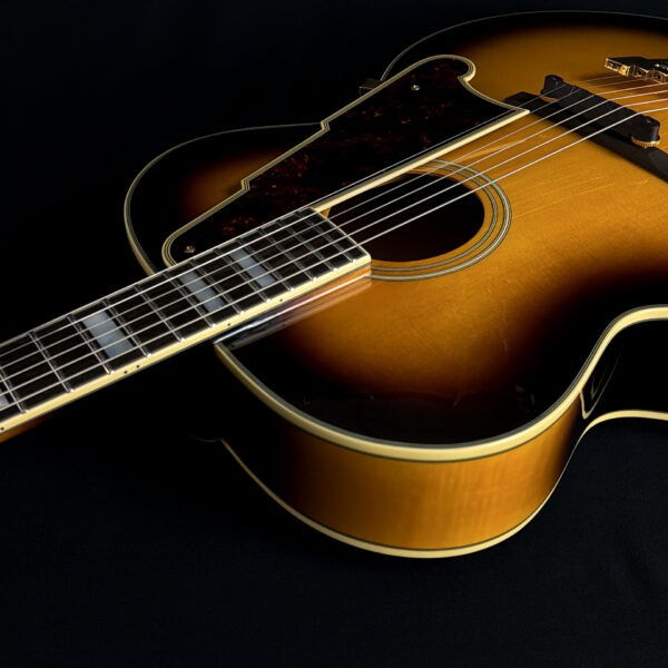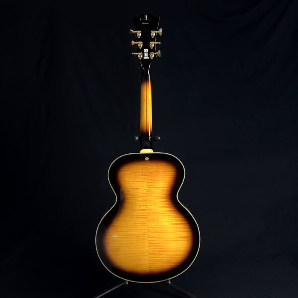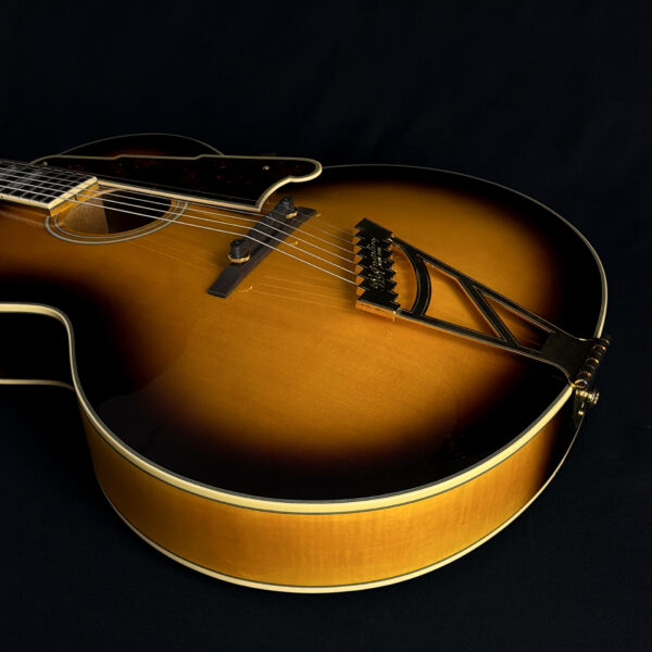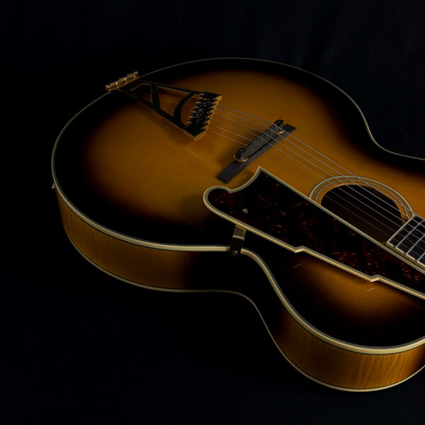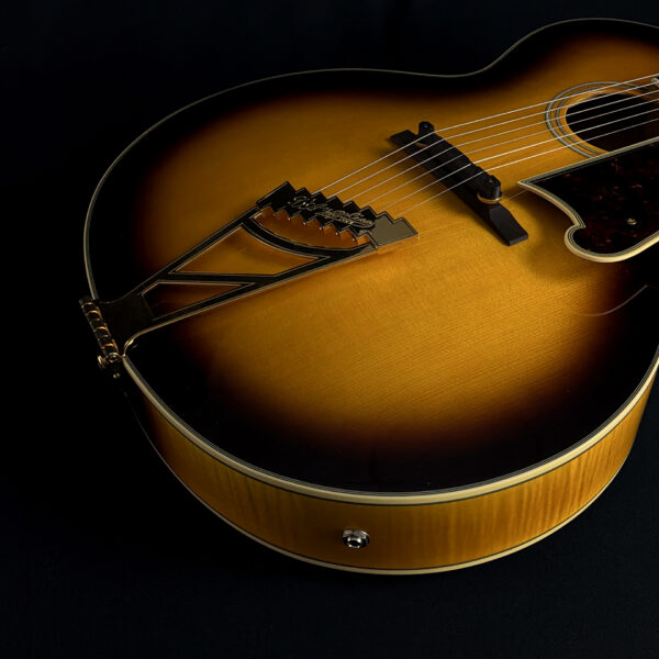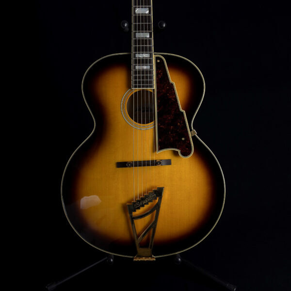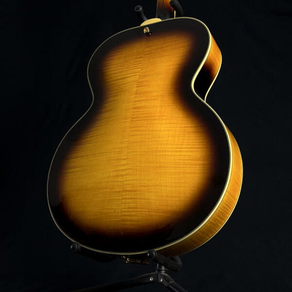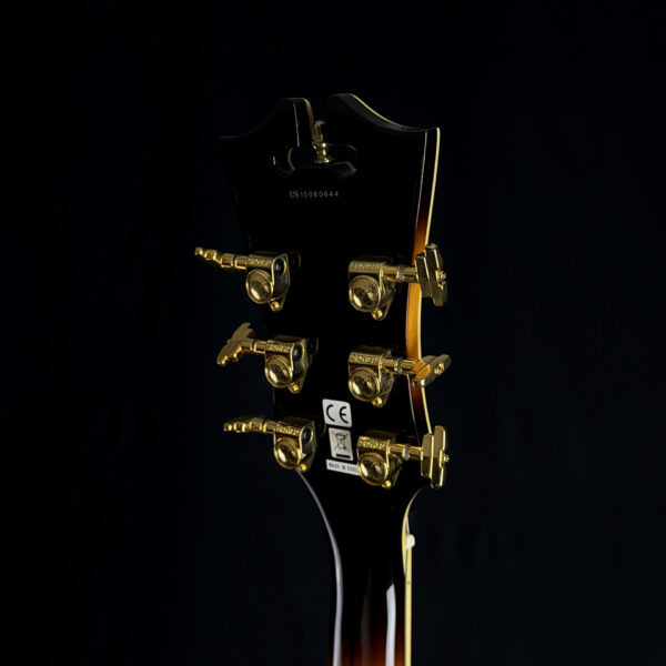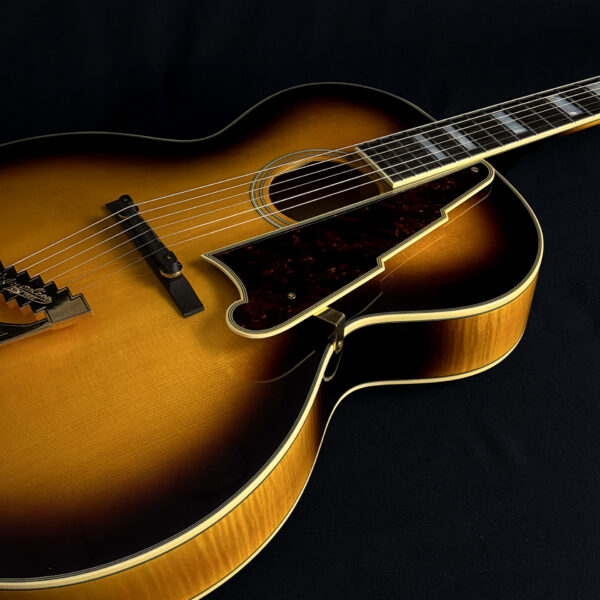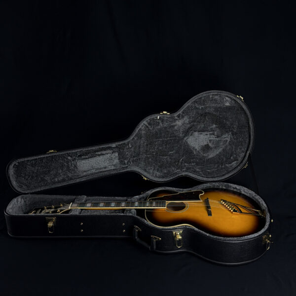 This 2015 D’Angelico EX-63 Electric-Acoustic Guitar is a hollow-body model with a vintage sunburst finish and USA-made construction. It features a laminated maple body, set maple neck, floating pickup, and standard volume and tone controls. This guitar is in excellent condition and includes a hard case.