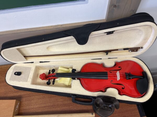 This is a Crescent HX violin in full size (4/4), suitable for beginner to intermediate players. It has a traditional wooden body with a natural finish and the classic violin design.