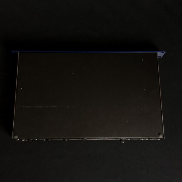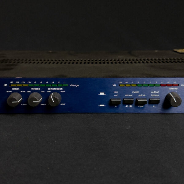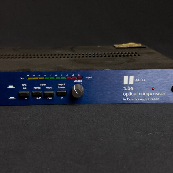 This Demeter Amplification H Series Rackmount Tube Optical Compressor is a studio-style compressor featuring an all-tube signal path with optical compression. It includes controls for gain, compression, and output level, with standard ¼” and XLR connectivity. This unit is in very good condition, with a blue faceplate and some sticker residue on the top rear of the chassis.