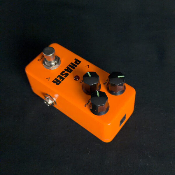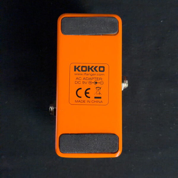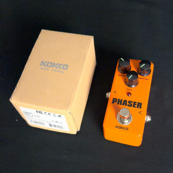 This Kokko Phaser Pedal is a compact analog phaser effect with controls for rate and depth. It produces phase-shifting modulation with adjustable speed and intensity in a simple two-knob layout.