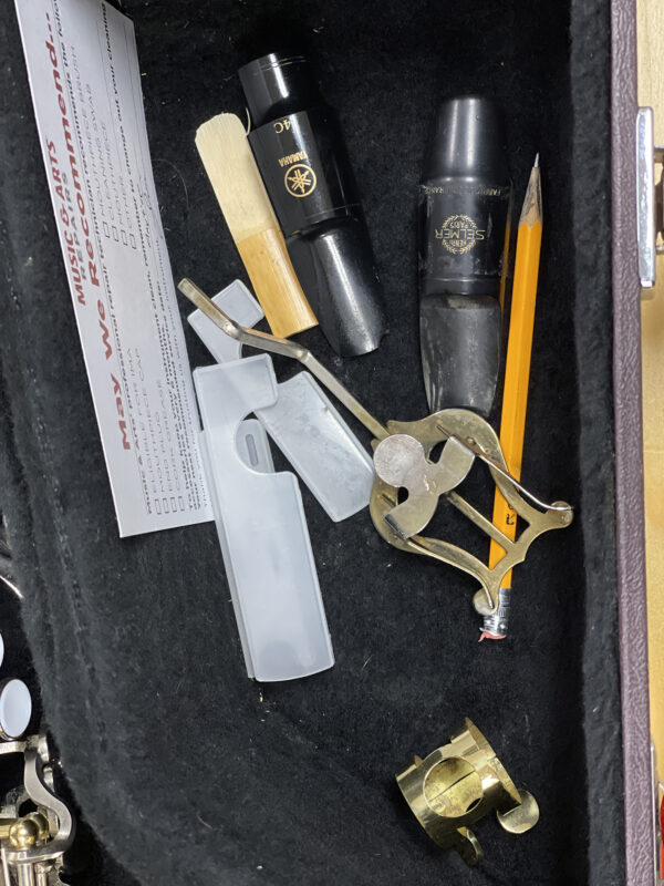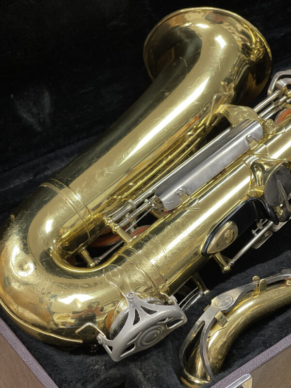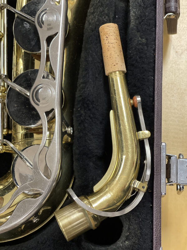 This saxophone was recently cleaned and serviced by a professional, which included replacing pads, regulating and oiling the key mechanism, straightening keys, and correcting leaks. It has moderate surface wear from use but is in great shape and plays well. Includes hard case.